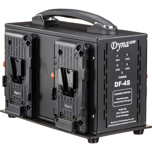 Simultaneously charge up to four Dynacore lithium-ion V-mount batteries with the dedicated DF-4S 4-Channel Quad Fast Battery Charger from Dynacore. It delivers a 16.8V output and a fast charge of 5A per channel, whether charging a single battery or multiple batteries.